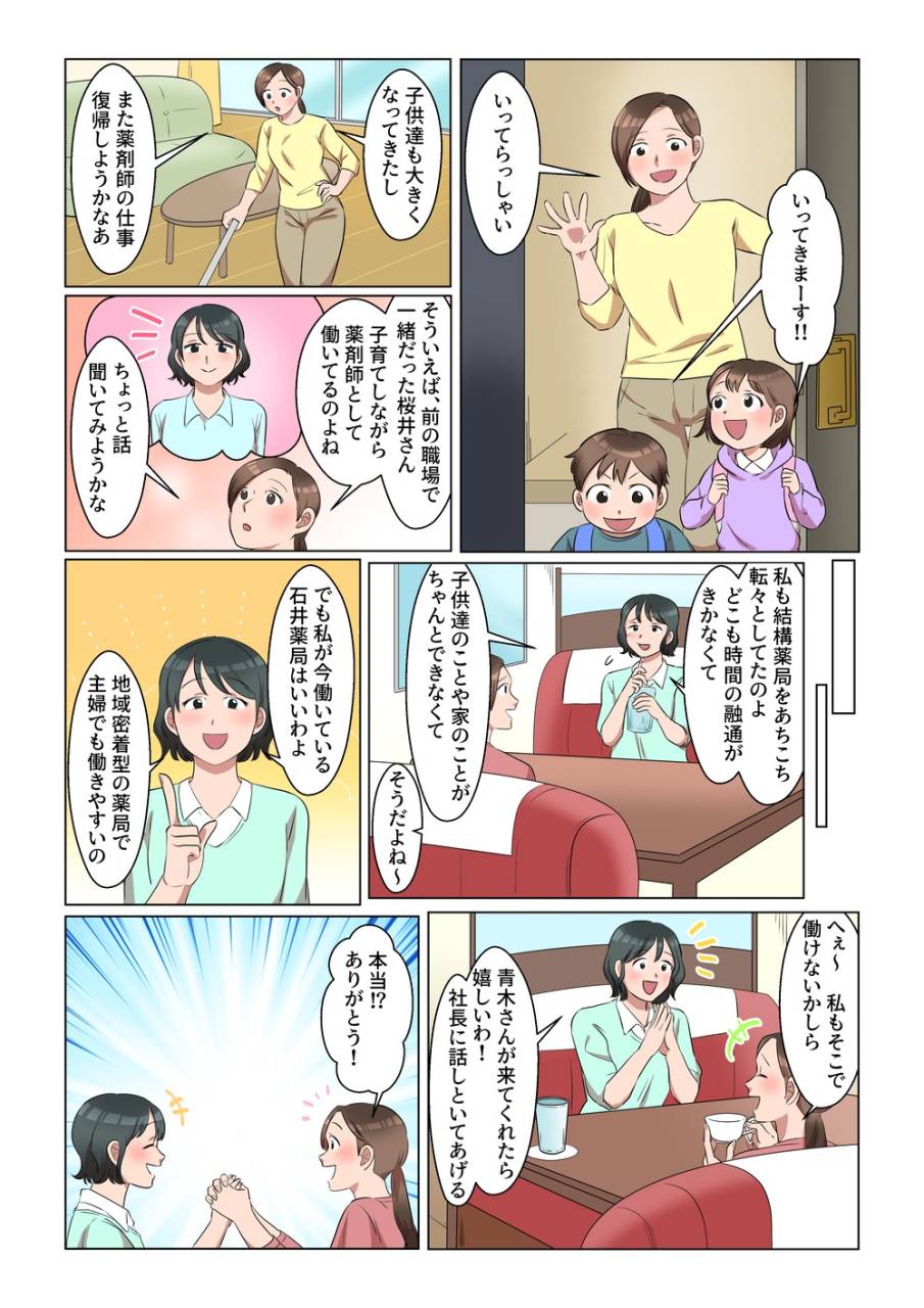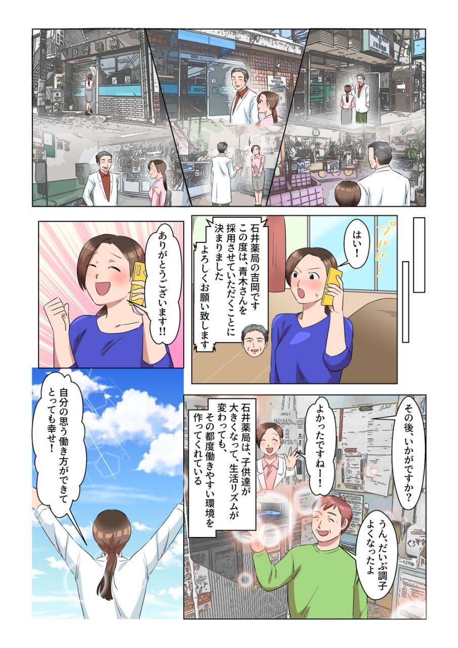 主人公・ナレーション「石井薬局は、子供達が大きくなって生活リズムが変わっても、その都度働きやすい環境をつくってくれている」